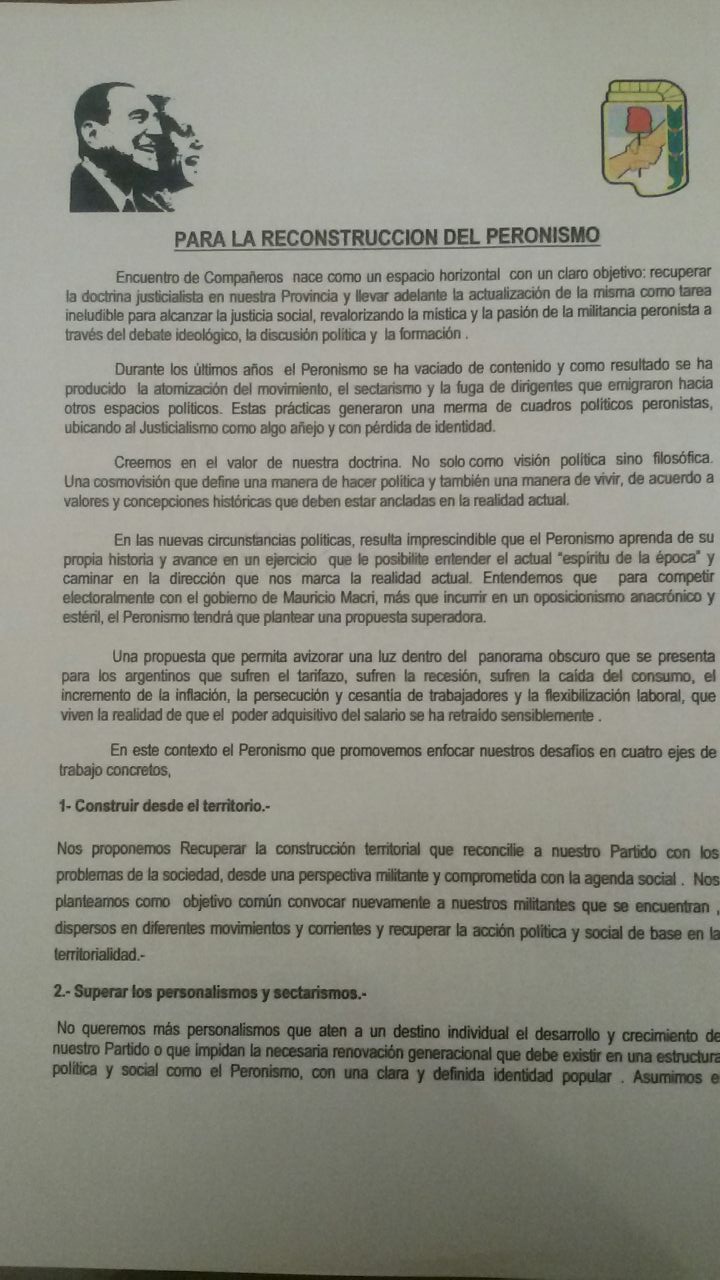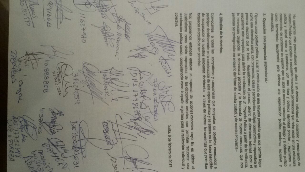 En un documento elaborado, tras el encuentro de dirigentes sindicales y de base, quedó plasmado la expresión misma de lo que opinan hoy miles de afiliados. Le exigen a las autoridades del PJ Salta (Urtubey, Isa) que se trabaje por la reconstrucción del partido, su doctrina y valores; no dejan de mencionar el pedido de apartar del seno de la organización los personalismos que mantienen hoy quienes representan los espacios de poder y del movimiento peronista.